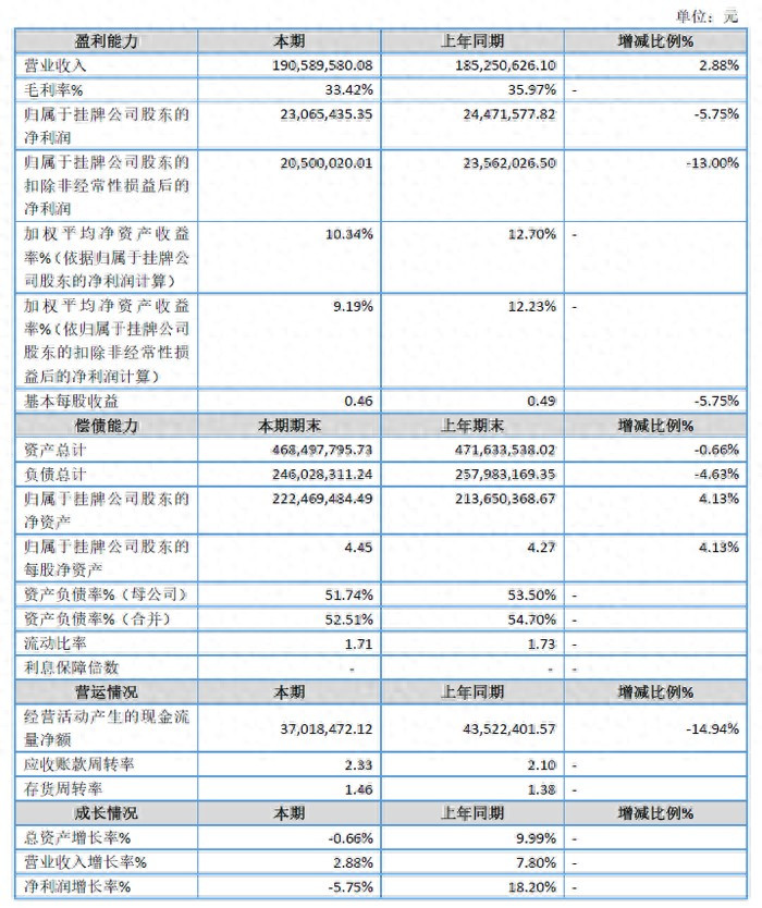 2025 年上半年,新亚胜(股票代码:871672)呈现出 “稳中有进、结构优化” 的发展态势。根据公司最新披露的半年报显示,报告期内实现营业总收入 1.91 亿元,较上年同期的 1.85 亿元增长 2.88%;实现净利润 2306.54 万元,较上年同期的 2447.16 万元小幅下降 5.75%。在复杂的市场环境下,公司通过深耕核心业务、优化市场布局和精准成本控制,展现出较强的经营韧性,同时加大研发投入为未来发展积蓄动能。