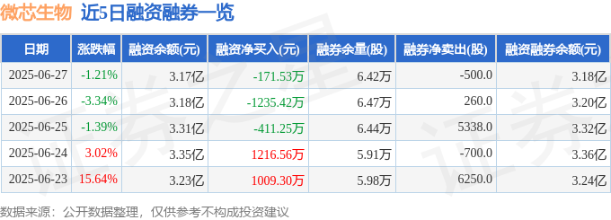本站消息,截至2025年6月27日收盘,微芯生物(688321)报收于23.75元,下跌1.21%,换手率1.68%,成交量6.83万手,成交额1.63亿元。